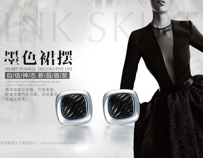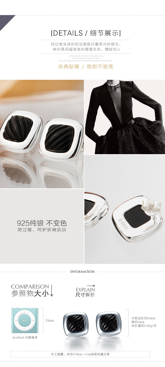 银时代 墨色裙摆 黑玛瑙方形耳钉 925银饰品 女 时尚耳饰 礼物